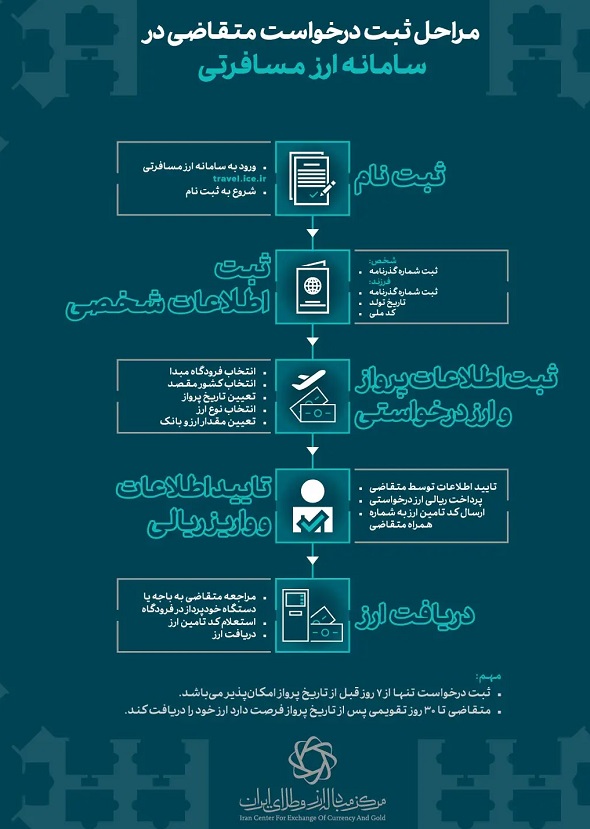 ثبت درخواست ارز مسافرتی تنها از ۷ روز قبل از تاریخ پرواز امکانپذیر است. ثبت درخواست در روز پرواز نیز امکانپذیر است.