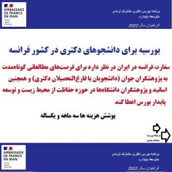 برنامه بورس دکتری مشترک ترددی سفارت فرانسه در ایران در حوزه توسعه پایدار، با هدف حمایت از پروژههای پژوهشی دانشجویان ایرانی مقطع دکتری که رساله خود را تحت نظر و...